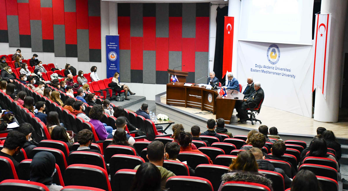 Eastern Mediterranean University Atatürk Research and Application Center (EMU-ATAUM) held a panel at EMU Mustafa Afşin Ersoy Hall at 14:30 on Tuesday, 21 December 2021, as the first event marking the 21-25 December National Struggle and Martyrs’ Week. The students, who had the opportunity to meet with those who made history, had the opportunity to listen to the Turkish Cypriots’ National Struggle. The panel started with a moment of silence and the National Anthem. EMU-ATAUM President Assist. Prof. Dr. Turgay Bülent Göktürk, Retired Mujahid Commander Ahmet Sevinç, Chair of the Association for Keeping Muratağa, Sandallar ve Atlılar Martyrs Alive, Ahmet Aşır and Retired Müjahid Yaşar Gevrek attended the event as speakers. Emphasizing that the 21-25 December National Struggle and Martyrs’ Week is a very important week for the Turkish Cypriots, EMU-ATAUM Chair Assist. Prof. Dr.Turgay Bülent Göktürk expressed his gratitude to the valuable mujahideen who witnessed this struggle and thanked them for their participation in the panel. Assist. Prof. Dr. Göktürk then read the statement he prepared for the National Struggle and Martyrs’ Week.