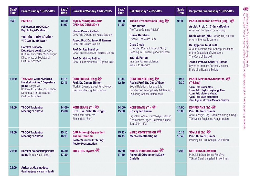 Organised annually by Eastern Mediterranean University Psychology Department and EMU Psychology Students Club, 9th Psychology Days will commence with a march taking place under the theme “Today is My Day”. Starting at EMU Activity Center at 9:00 a.m. on 10 May 2015, the march will end at Famagusta Sakarya Roundabout.