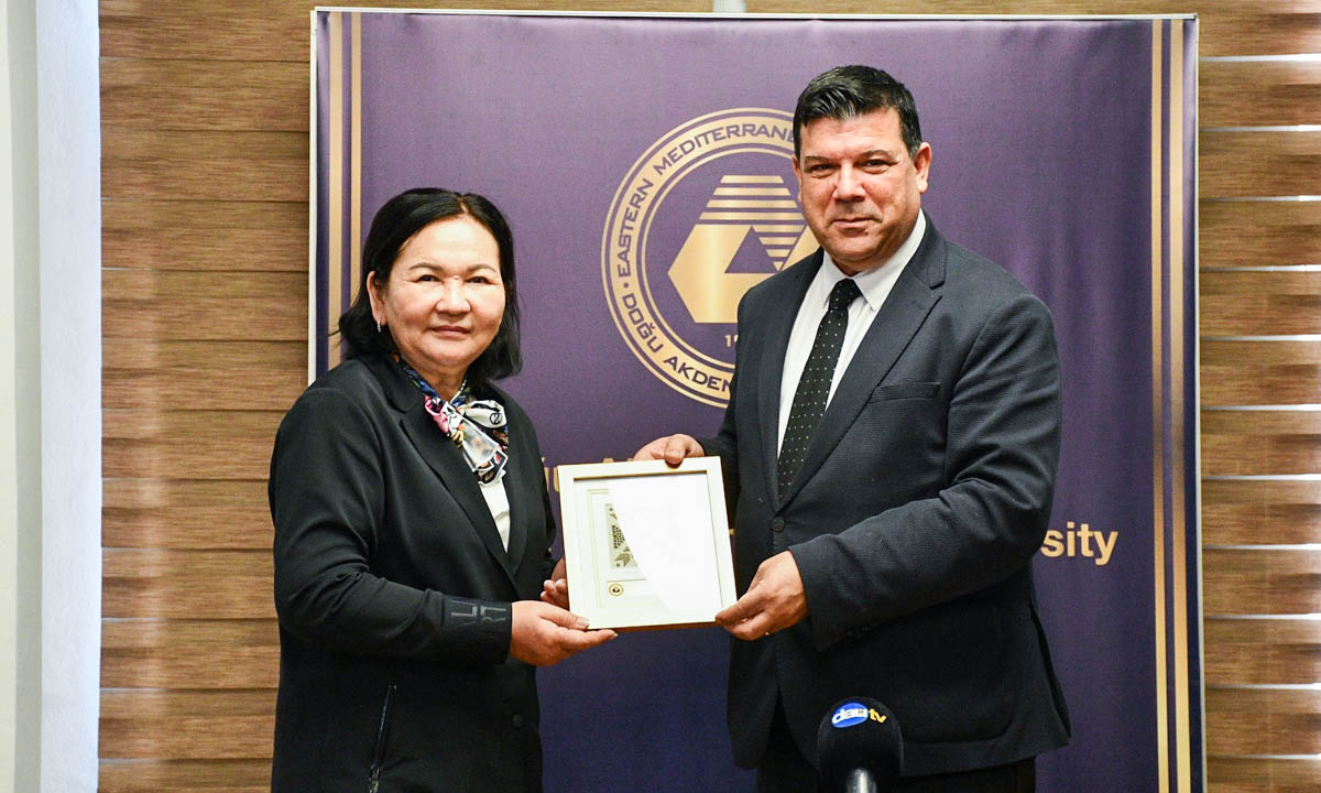 Following the signing session, EMU Rector Prof. Dr. Hasan Kılıç presented Kyrgyz State University Rector Prof. Dr. Tolokovna a traditional Cypriot Lefkara work panel and EMU souvenirs. On the other hand, Prof. Dr. Tolokovna presented Prof. Dr. Kılıç a souvenir unique to their university.
