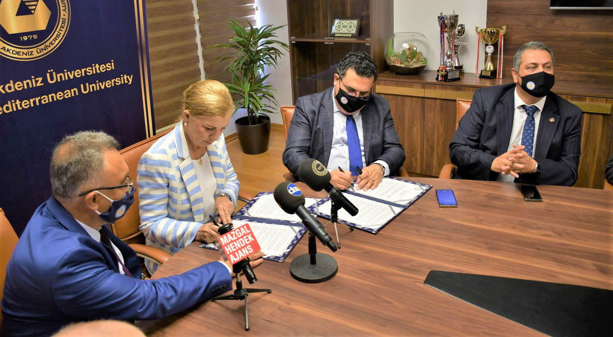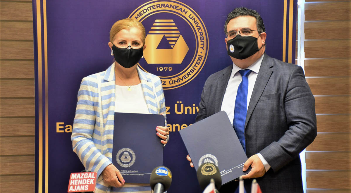 The signing ceremony took place on Thursday, 19 August, 2021 at 10:00 a.m. at the EMU Rector’s Office Meeting Hall. President of EMU Board of Trustees Dr. Erdal Özcenk, EMU Board of Trustees Member Ersun Kutup, EMU Vice Rector for Academic Affairs Prof. Dr. Hasan Demirel, Vice Rector for Student Affairs Prof. Dr. Hüseyin Aktuğlu, Vice Rector for Administrative and Technical Affairs Prof. Dr. Serhan Şensoy and Vice Rector for Social and Cultural Affairs Prof. Dr. Deniz İşçioğlu attended the said ceremony.