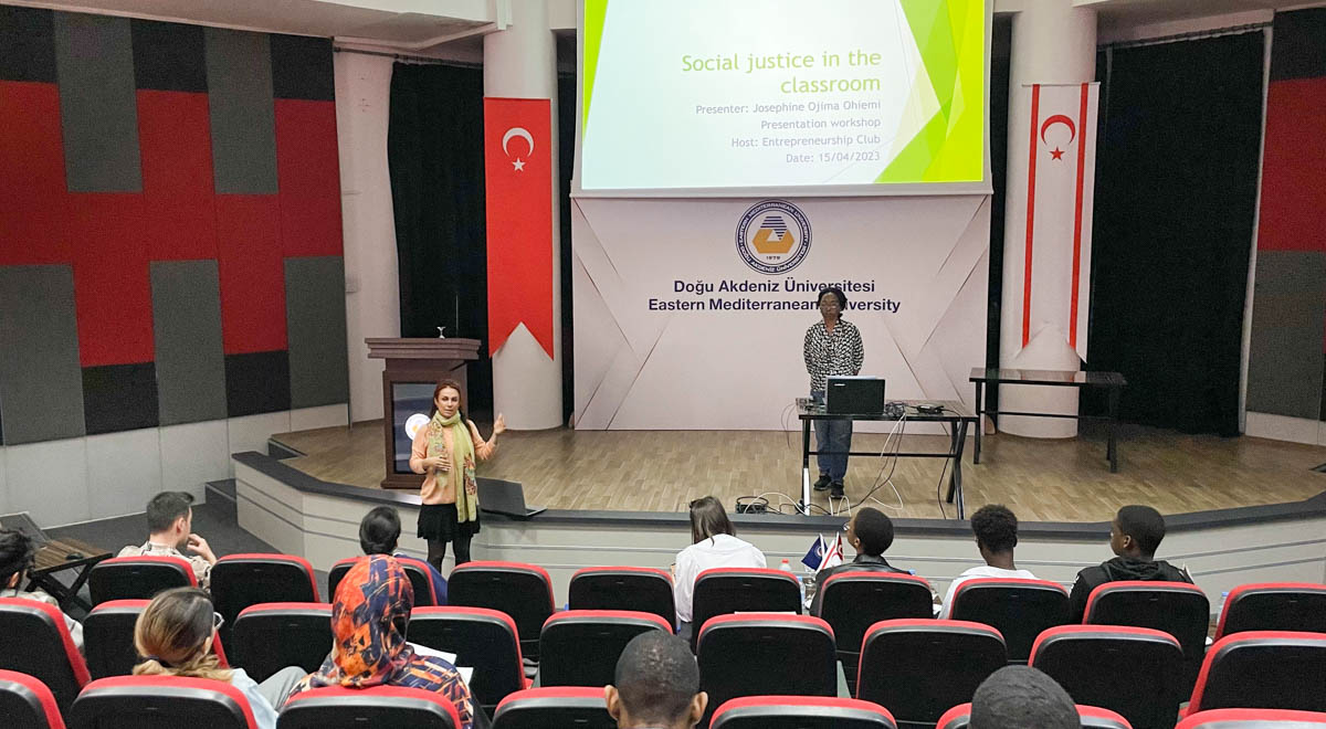 Eastern Mediterranean University (EMU) Entrepreneurship Club operating under EMU Social and Cultural Activities Directorate organized an Effective Speaking in front of a Group seminar with the slogan of “Are You Ready to be the Star of the Stage?”. The seminar took place on Friday, 14 April 2023 at 17:30 at CL lecture halls where speaking in front of a group was discussed.