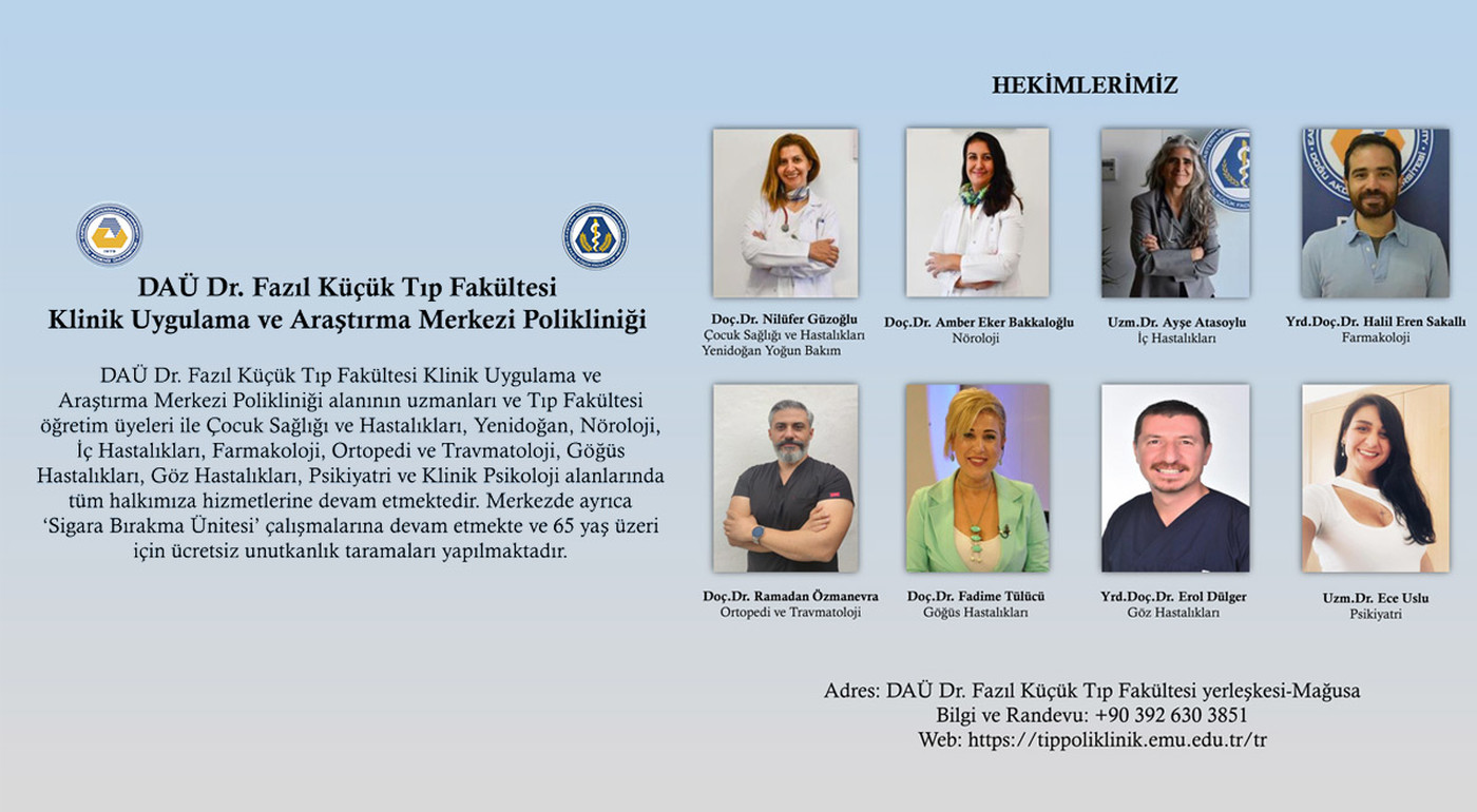 Eastern Mediterranean University (EMU), Dr. Fazıl Küçük Medicine Faculty, Clinical Practice and Research Center continues to provide polyclinic services with its expert staff members. With its staff and Faculty of Medicine academics, EMU Dr. Fazıl Küçük Medicine Faculty, Clinical Practice and Research Center offers services in the fields of Pediatrics, Neonatal, Neurology, Internal Diseases, Pharmacology, Orthopetics and Traumatology, Pulmonology, Eye Diseases, Psychiatrics and Clinical Psychology. Moreover, ‘Smoking Cessation Unit’ and Lactation Counselling services are also available at the center. Members of the society who are older than 65 can get a free dysmnesia checks at the center.