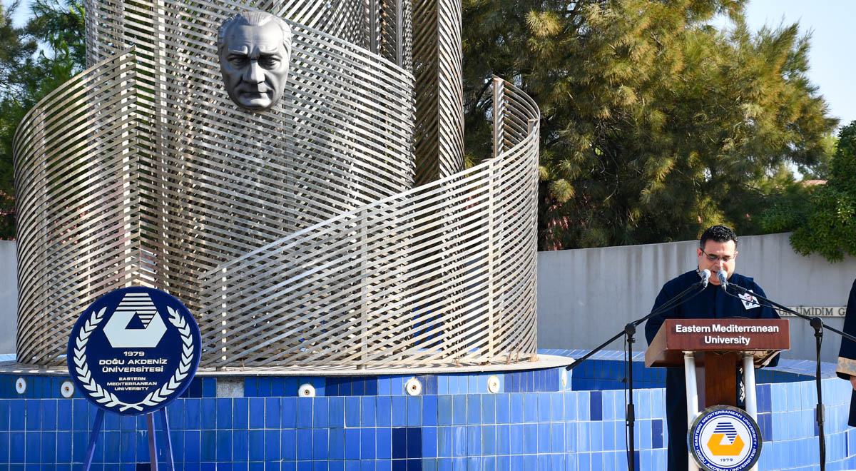 In scope of the commemoration ceremony program, a wreath was laid on Atatürk’s Monument at 09:00 a.m. by EMU Rector Prof. Dr. Aykut Hocanın. At 09:02 a.m., EMU-ATAUM Chair Assist. Prof. Dr. Turgay Bülent Göktürk read 10 November Statement.