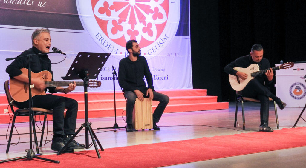 The 2018 – 2019 Academic Year Fall Semester Convocation Ceremony began as the post-graduate students entered the hall accompanied by music and acclamation. As the graduates entered, the academicians turned towards the families, who greatly contributed to the students’ achievement, and greeted the graduates. A wave of emotions swept through the hall as the graduates made their entrance. The ceremony continued with a Moment of Silence and the Turkish National Anthem. The guests were also delighted by a magnificent trio music performance by EMU Faculty of Education, Department of Fine Arts, Music Teaching program academic members Serkan Çankaya (Classical Guitar), Altay Altınok (Percussion) and Levent Ünal (Acoustic Guitar and Soloist). After the music performance, EMU Faculty of Communication, Communication Programme Graduate Hanife Erişen gave a speech on behalf of the 2018 – 2019 Academic Year Fall Semester Master’s Graduates.