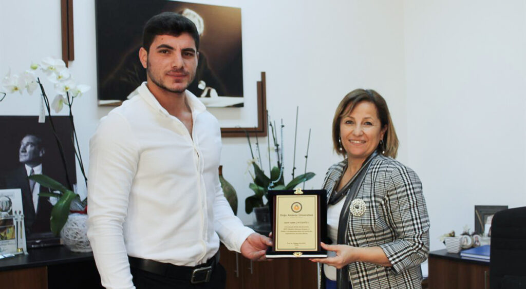 Whilst coming third in Turkey, Eastern Mediterranean University (EMU) Health Sciences Faculty, Department of Sports Sciences third year student Adem Çavuşoğlu broke the Turkish Republic of Northern Cyprus (TRNC) record in javelin with a throw of 60.83 metres. EMU student Çavuşoğlu broke Hamis Çakır’s previous record at the 18th Seyfi Alanya Throwing Cup which took place in Mersin’s Nevin Yanıt Athletics Complex. Çavuşoğlu also holds the TRNC youth records with a throw of 57.17 metres. After his latest achievement, Çavuşoğlu was congratulated and awarded a plaque by EMU Health Sciences Faculty Dean Prof. Dr. Mehtap Malkoç along with the Vice-Deans and Department of Sports Sciences academic staff.