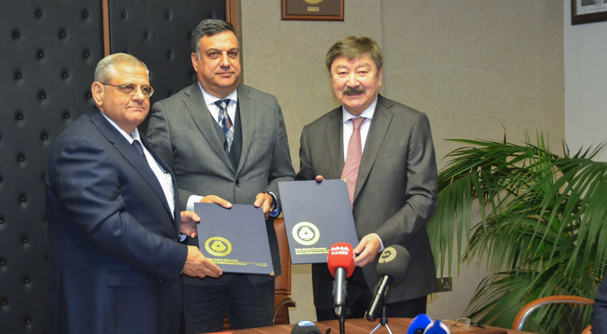 The Eastern Mediterranean University (EMU) signed a collaboration protocol with the International Organization of Turkic Culture (TÜRKSOY) on Friday, the 22nd of December 2017 at 10:00. During the ceremony which took place at the EMU Rector’s Office, the collaboration protocol was signed by EMU Rector Prof. Dr. Necdet Osam and TÜRKSOY Secretary-General Prof. Dr. Düsen Kaseinov.