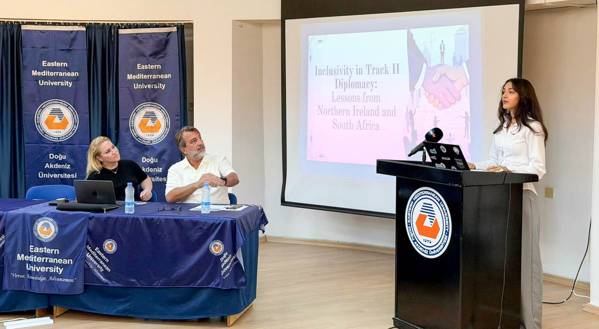 Then seminar continued with a speech by EMU International Relations Department student Aysel Rahmanova who talked about her internship process last summer in the Nicosia buffer zone and her observations of conflict resolution practices in Northern Ireland and South Africa. Rahmanova analysed the effects of Track II diplomacy in these contexts and discussed how the lessons learned might be applied to the Cyprus issue. Moreover, she emphasized key aspects such as international ownership, conditional inclusivity, technical drafting processes, and civil society engagement in the examples she examined.