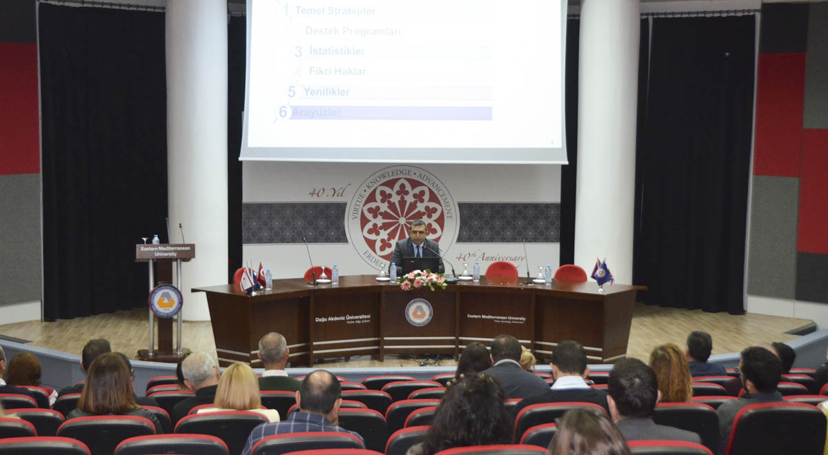 The Eastern Mediterranean University (EMU) hosted the Scientific and Technological Research Council of Turkey, Research Support Programs Departments’ (TÜBİTAK-ARDEB) Acting Vice President Assoc. Prof. Dr. Cengiz Arıcı. Presenting at the Mustafa Afşin Ersoy auditorium Assoc. Prof. Dr. Arıcı gave a conference on the programs that are carried out within the remit of TÜBİTAK-ARDEB. The conference was attended by Vice Rector for EMU Promotional Affairs Prof. Dr. Hıfsiye Pulhan, deans of the faculties, deputy deans, department heads, academicians and students.