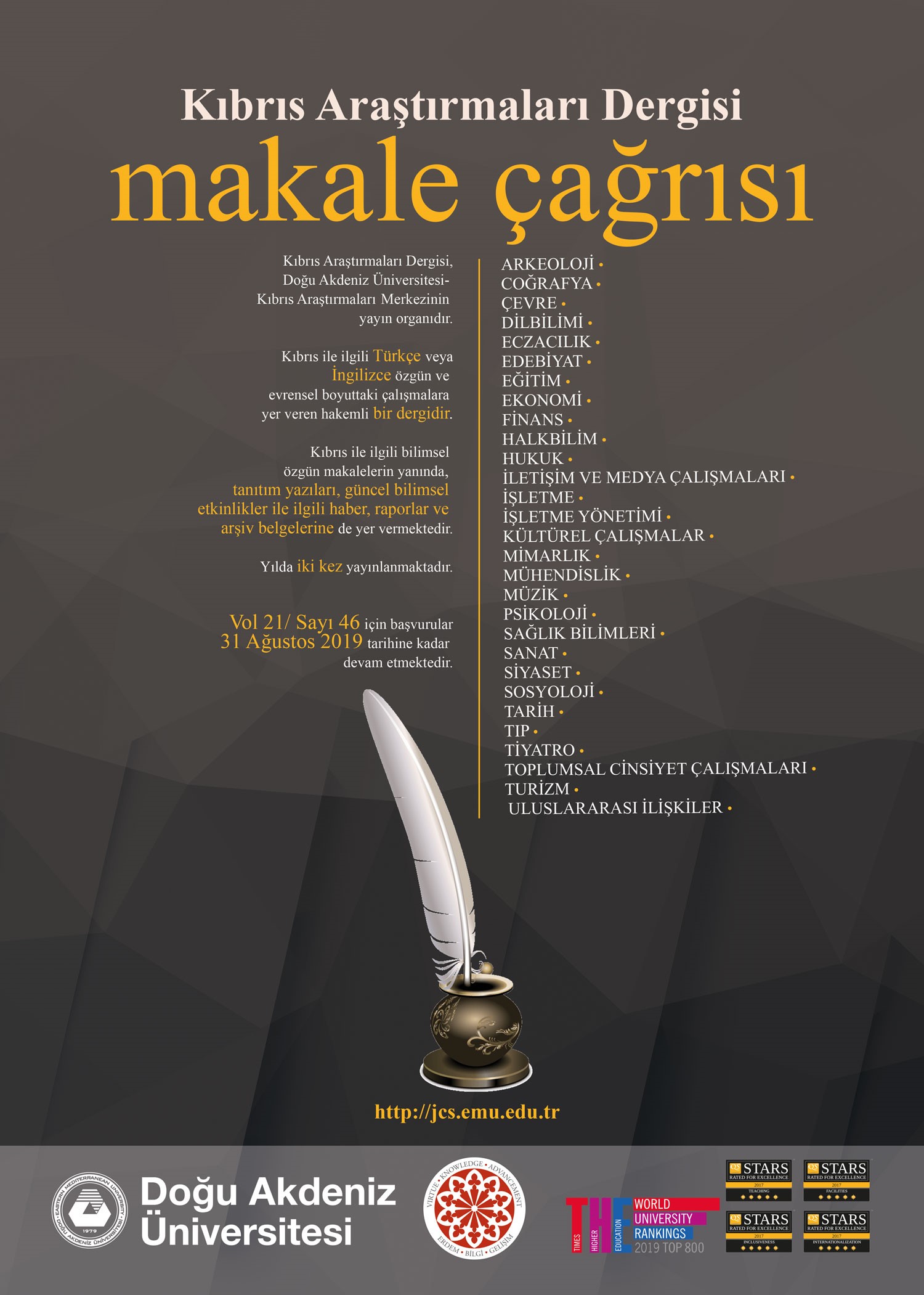 Doğu Akdeniz Üniversitesi Kıbrıs Araştırmaları Merkezi’nin (DAÜ-KAM) süreli yayınlarından olan Kıbrıs Araştırmaları Dergisi yeni yayın kurulu ve yeni hedeflerle makale kabulüne başladı. Yayın hayatına 1995’de başlayan Kıbrıs Araştırmaları Dergisi, Kıbrıs ile ilgili özgün bilimsel makalelerin yanı sıra; tanıtım yazıları, güncel bilimsel etkinlikler ile ilgili haberler, raporlar ve arşiv belgelerine de yer veriyor.