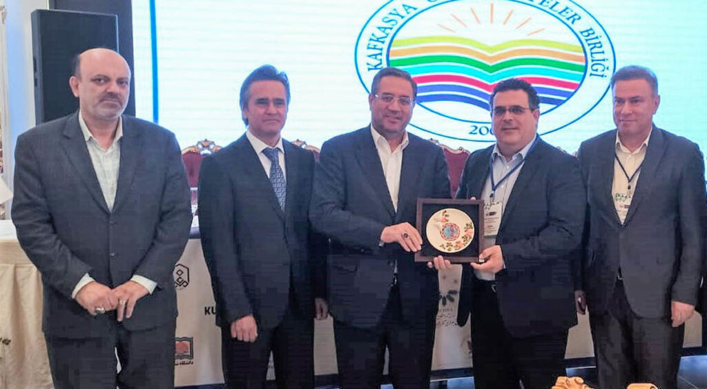 Prof. Dr. Hocanın, İran ziyaretinin ilk iki gününde, Kafkasya Üniversiteler Birliği (KÜNİB) tarafından Tebriz Royal Palace Hotel’de düzenlenen Tebriz Eğitim Fuarı’na katıldı. Prof. Dr. Hocanın, fuar kapsamında gerçekleştirilen açılış konuşmalarında kürsüye davet edildi ve katılımcılara DAÜ hakkında bilgi verdi. Prof. Dr. Hocanın, ayrıca İran İslami Şura Meclisi Eğitim Komitesi Başkanı Alirıza Monadi, İran Eski Sanayi, Maden ve Ticaret Bakanı ve İslami Şura Meclisi Vekili Rıza Rahmani, İran Cumhurbaşkanı’na bağlı Eğitim Müşavirliği Komisyon Başkanı Dr. Reza Ameri ve Türkiye Cumhuriyeti Dışişleri Bakanlığı Tebriz Başkonsolosu Çetin Taner ile de birebir görüşerek fikir alış verişinde bulundu.