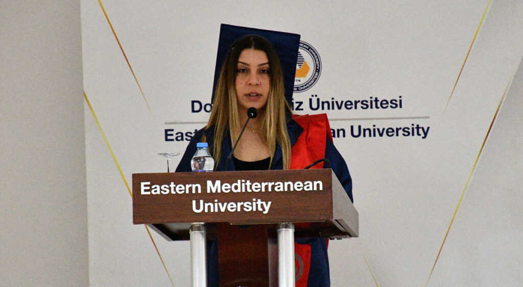 Saygı Duruşu ve İstiklal Marşı’nın ardından başlayan törende İngilizce bölümleri temsilen Sağlık Bilimleri Fakültesi, Fizyoterapi ve Rehabilitasyon Bölümü mezunu Tayseer Said Al- Tamimi ile Sağlık Bilimleri Fakültesi, Egzersiz ve Spor Bilimleri Bölümü birincisi Remziye Kızılbora mezunlar adına birer konuşma gerçekleştirdi.