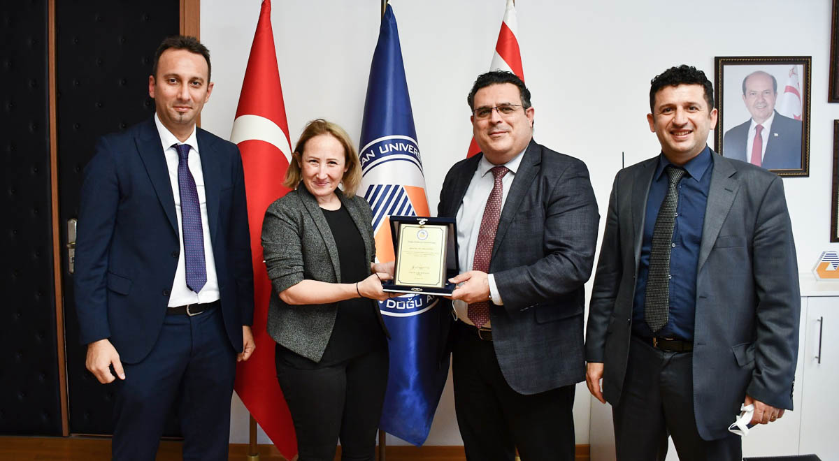 DAÜ Rektörü Prof. Dr. Aykut Hocanın’ı makamında ziyaret eden Doç. Dr. Ateşin, DAÜ’de bulunmaktan duyduğu memnuniyeti dile getirdi. Prof. Dr. Hocanın, ziyaret sırasında DAÜ hakkında bilgiler vererek Doç. Dr. Ateşin’i ağırlamaktan son derece mutlu olduklarını bildirdi. Ziyaret sonunda Prof. Dr. Hocanın Doç. Dr. Ateşin’e Kıbrıs’a özgü Lefkara işi pano takdiminde bulundu. Ziyarette DAÜ Fen ve Edebiyat Fakültesi Dekanı Prof. Dr. Mehmet Ali Özarslan, DAÜ Fizik ve Kimya Bölümleri Başkanı Prof. Dr. İzzet Sakallı, Kimya Bölümü Öğretim Üyeleri Prof. Dr. Osman Yılmaz, Prof. Dr. Elvan Yılmaz ile Prof. Dr. Mustafa Gazi de hazır bulundu.