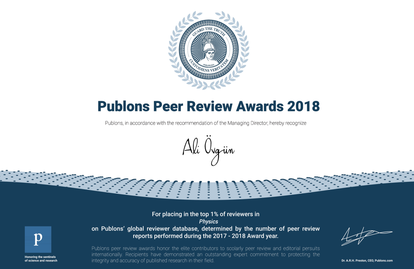 Doğu Akdeniz Üniversitesi (DAÜ) Fen-Edebiyat Fakültesi Fizik Bölümü doktora mezunlarından ve aynı zamanda 2018-2019 akademik yılında Fizik bölümüne araştırma ve eğitim-öğretim faaliyetlerinde destek vermek amacıyla misafir kadroda görevlendirilen Yrd. Doç. Dr. Ali Övgün’den büyük dergi hakemliği başarısı: Publons 2018 hakemlik ödülü.